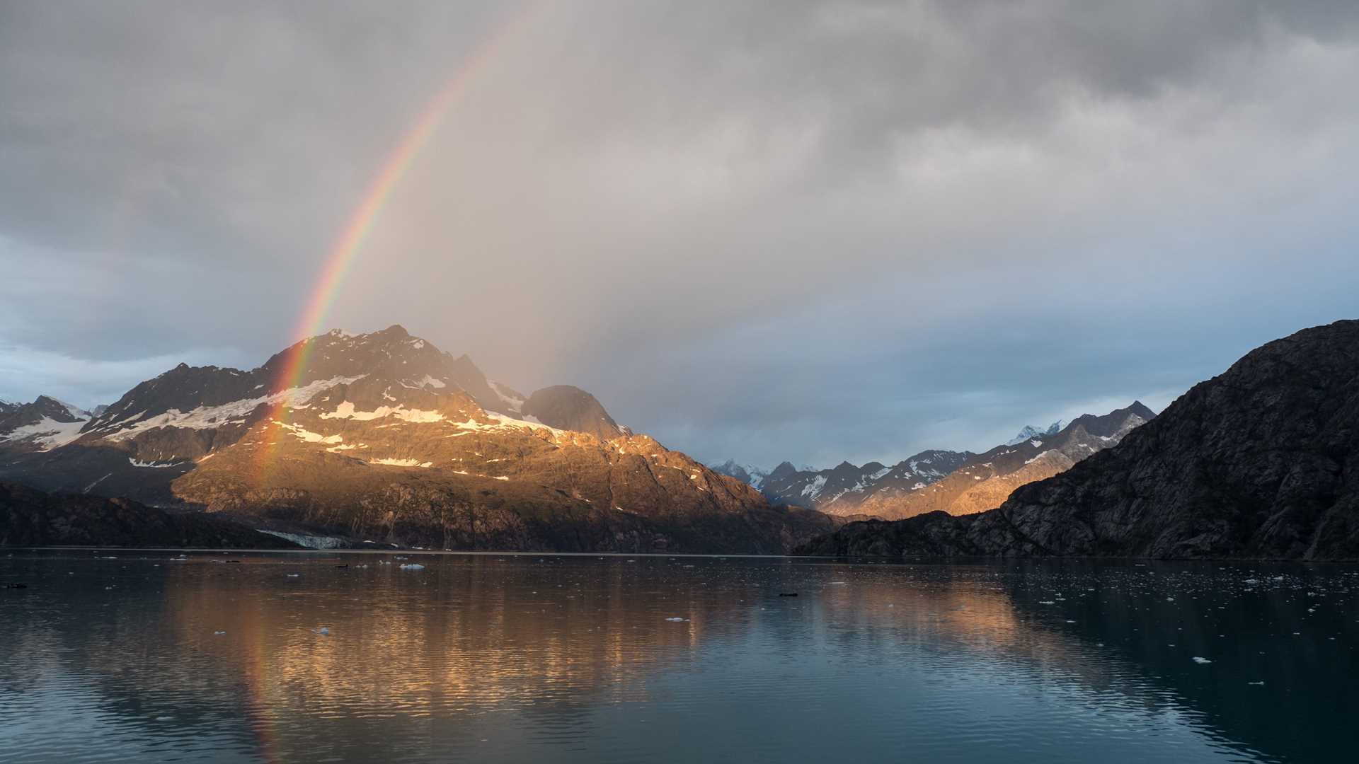 The first moment of daybreak told of the magical day ahead. The first light shot a low angle of brilliance across the water. When it reached the foothills of the Fairweather Range, a rainbow appeared. That was just the beginning.