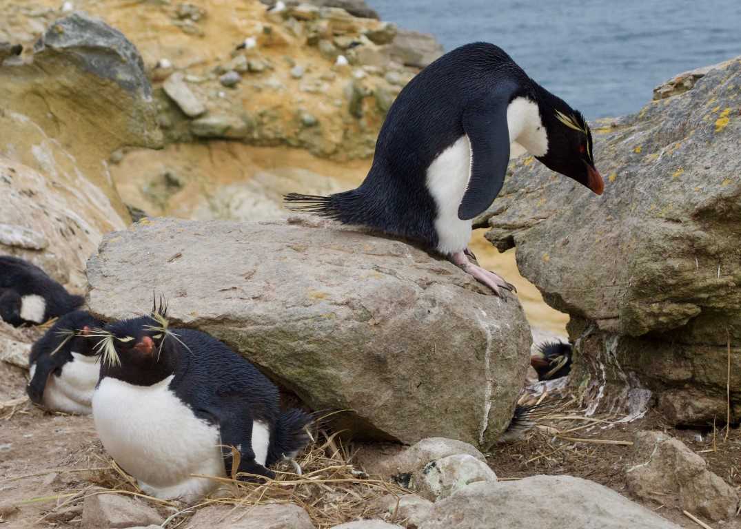 We woke up sailing on choppy seas with northerly winds of 45 knots. As we approached New Island, the team was unsure whether a landing would be possible in those conditions. The situation took a promising turn as National Geographic Orion found shelter and anchored in close proximity to the harbour allowing us to disembark safely onto the beach. Several pairs of kelp geese and oystercatchers were feeding at the shoreline. But the main reason for our landing was to visit a very special bird colony on the west coast of the island. On our way to the colony, we were surprised by some interesting sightings along the walk. We encountered a group of feeding caracaras and turkey vultures, as well as many pairs of nesting upland geese, some walking around with a number of fluffy chicks. When we reached the western side of the island, we found ourselves at the top of the spectacular colony of rockhopper penguins, imperial shags, and black-browed albatross. Brown skuas flew over the colony while penguins, albatross, and shags took care of their eggs. We spend a good bit of time photographing the birds and generally taking in such wonderful experience and close views of the wildlife.