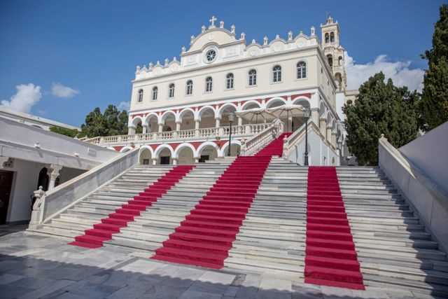 Our bus dropped us in front of the Church of the Virgin Mary known all over Greece for its miraculous icon of the Annunciation. The church was built in the 1820s at the place where the icon was found. They call Tinos the “Lourdes” of Greece, and people come from all over the country for the big festival of the Assumption on August 15th. Sick people especially ask the Virgin Mary to give them back their health. Traditionally people who are cured offer a gift to the church. As we entered the church, we saw the icon resting on a custom marble stand, surrounded by hundreds of gifts hanging on special chains connecting the columns of the church.