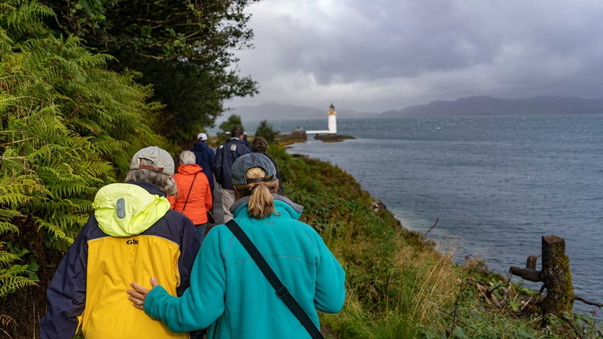 We woke in Tobermory to a showery day, with the morning to explore this colorful waterfront town. Despite the rain, a group walked out to a nearby lighthouse, following a trail through the Celtic rainforest, with moss, lichen, and ferns coating the trees along the way. Our endpoint was a picturesque Stevenson lighthouse, designed by the family of Robert Louis Stevenson. Those who didn’t take the walk spent the morning shopping in town, perusing offerings from chocolates to books.