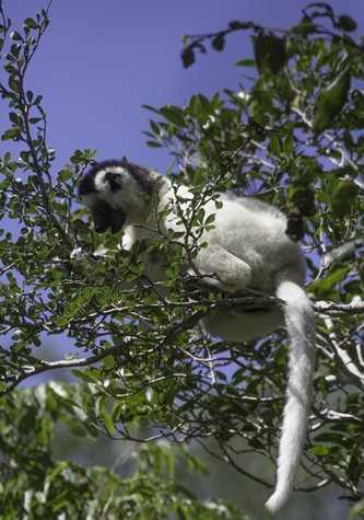 The landscape around us changed from scrub to savannah to grazed grasslands and finally to a low, dry forest where we stopped for a walk in Zambitse National Park. We strolled along the easy trails with our local guides and very soon came upon a small group of Verraux’s Sifakas, our first wild lemurs! These beautiful snowy white primates were moving through the trees only a few feet above our heads, clambering from one branch to another and occasionally making long, graceful leaps as they searched for the tastiest tender leaves. We watched them for some time, burning up a great many pixels photographing, then moved on down the trail in search of more wildlife. And we saw quite a bit more: a huge Austerlitz chameleon, a crested drongo, and a Madagascar paradise flycatcher and, certainly the best of all, a little brown sportive lemur–a night active species—huddled into a broken crotch of a large tree but still in good view for our binoculars and cameras.