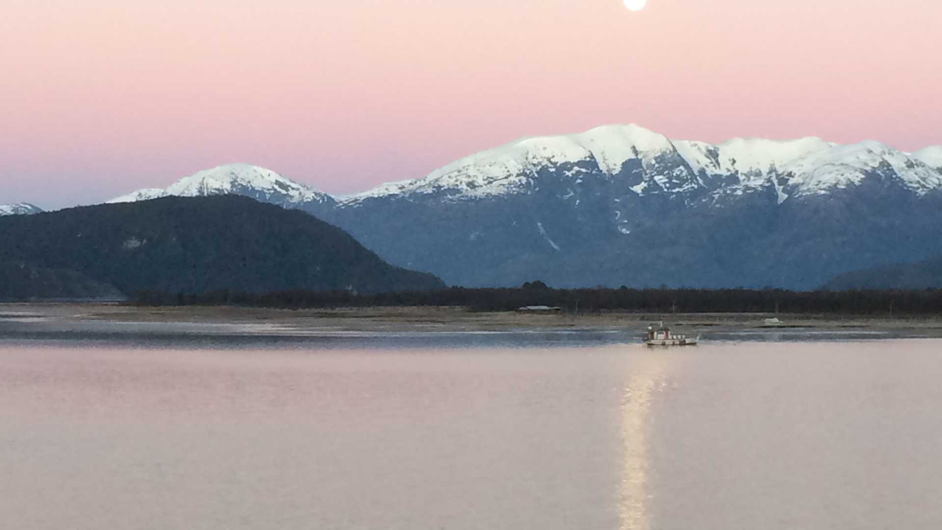 An early wake-up call alerted everyone to a photo opportunity and view of the full moon setting in clear skies among snow-capped peaks. We were approaching the small, remote community of Tortel. Spread out over a high, rounded hill south of the mouth and delta of the Rio Baker, Tortel consists of 500 inhabitants whose homes and businesses are connected by wooden boardwalks. A spur route off the Austral Highway connects the town to the outside world. But the road ends on the edge of the town and turns into boardwalks spiderwebbed throughout the village.