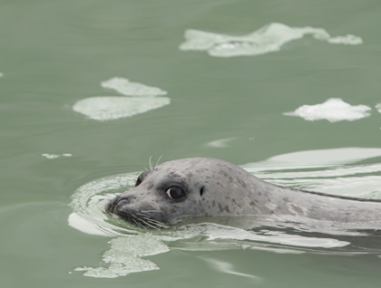 We continued our way deeper into the fjord and boarded our expedition landing craft for a couple of rounds in the evening. Cruising around growlers, bergie bits, and icebergs, we approached the magnificent South Sawyer Glacier. Originated in the Stikine Icefield, the South Sawyer is one of the southernmost tidewater glaciers in North America and certainly one of the prettiest. Multiple areas of deep blue ice contrasted sharply with the bare rock, whereas the occasional calving caused great excitement among us. Lots of ice in front of the glacier was occupied by sleeping harbor seals; this area is an important breeding ground for the species and we saw many young seals of the year swimming around. After being nursed by their mothers for only a few weeks, the pups are already independent and fishing for lanternfish and other prey by themselves. Many were very curious and swam close, looking at us with large beady eyes, thinking perhaps that we were some kind of strange seal on top of a piece of black ice.