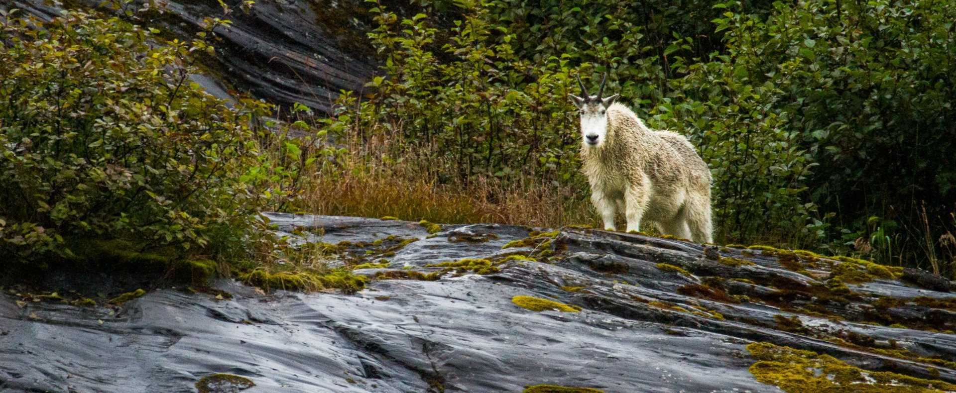 After breakfast we approached the end of the fjord and launched our expedition landing craft to get closer looks at the magnificent South Sawyer glacier. As we wended our way through a gallery of sculpted ice floating in the water, we spotted some mountain goats perched on the cliffs above the fjord. Swimming between the bergs we also encountered several curious harbor seals still hanging around amongst the ice after the pupping season which draws them to the safety of the icebergs had ended. Rounding a bend, the jumble of seracs and crevasses that comprise South Sawyer came into view and we marveled at the phenomenal blue hue.