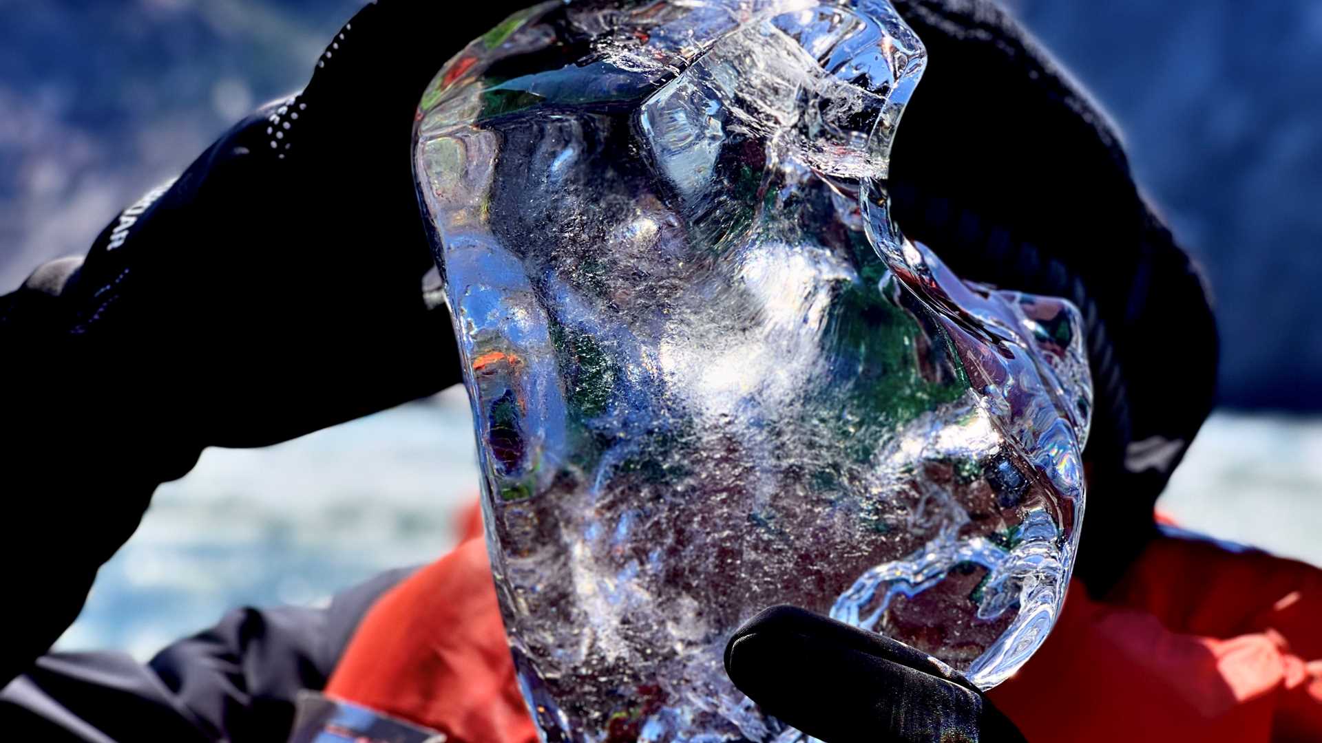 Photo caption and credit: Lindblad Expeditions guest John peers through a piece of glacial ice, known as brash ice, classified by its size of smaller than one foot tall. Photo by Kelly Morgan