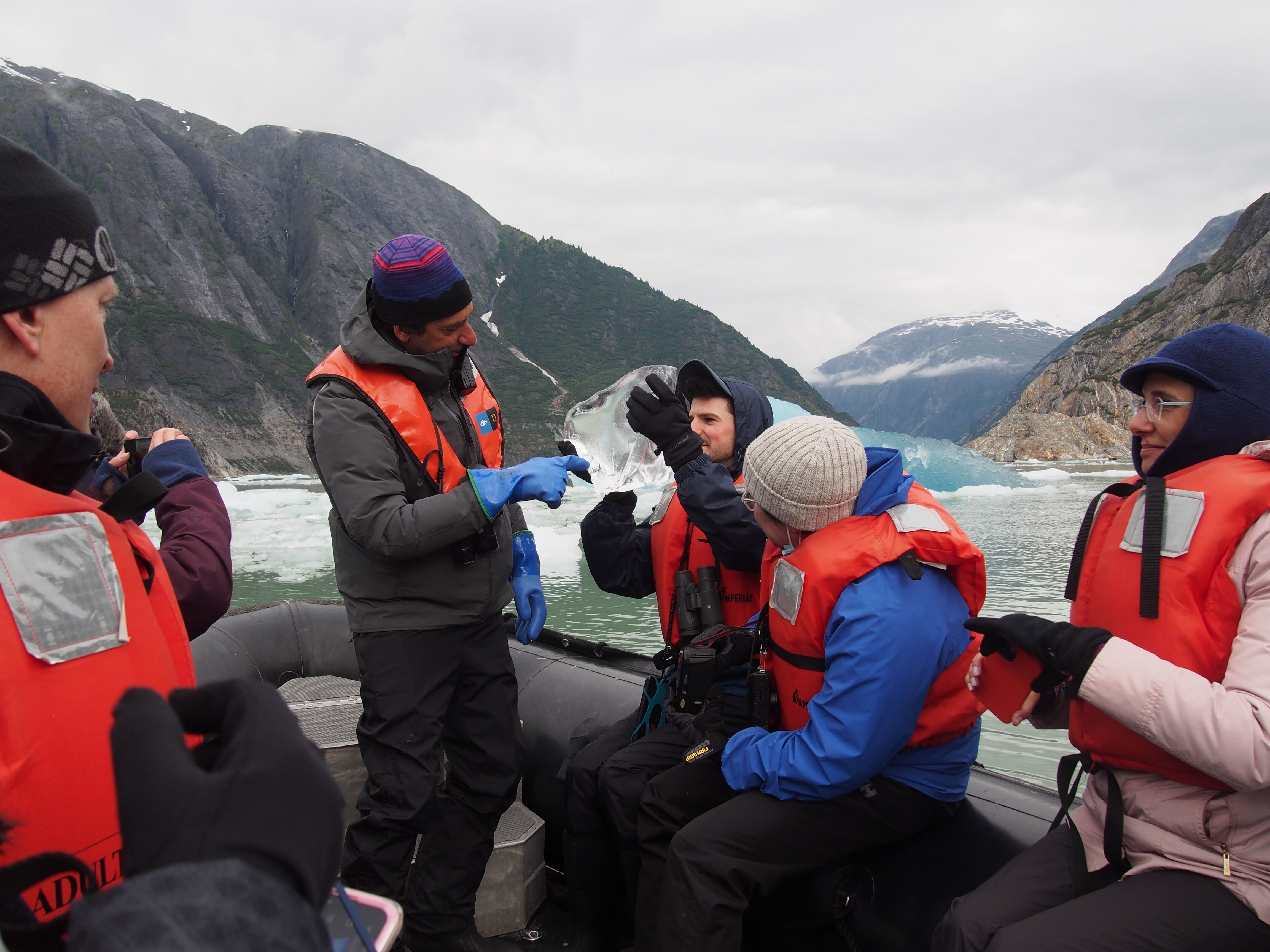 Guests awoke aboard National Geographic Sea Lion on their first morning as the ship maneuvered into the majestic Tracy Arm-Fords Terror Wilderness. Glacially carved mountains grew out of the almost tropical looking water and climbed high into the clouds. As guests enjoyed morning coffee around 7:00 a.m., a black bear along the shoreline entertained them while grazing for a morning meal. After breakfast, we loaded the Zodiacs and took off for an adventurous start. Zipping through the fjord with the wind in our hair, we spotted a lone mountain goat grazing high up on the alder bushes. Farther along, closer to South Sawyer Glacier, harbor seals were easily spotted. Their shiny heads and curious eyes poked up just above the water line. To our delight, the mythical thunder bird roared multiple times. Calvings and shooters were witnessed, with royal blue ice exposed. The beauty and density of glacier ice were studied firsthand as guest were able to look closely at the intricate details of a growler.
