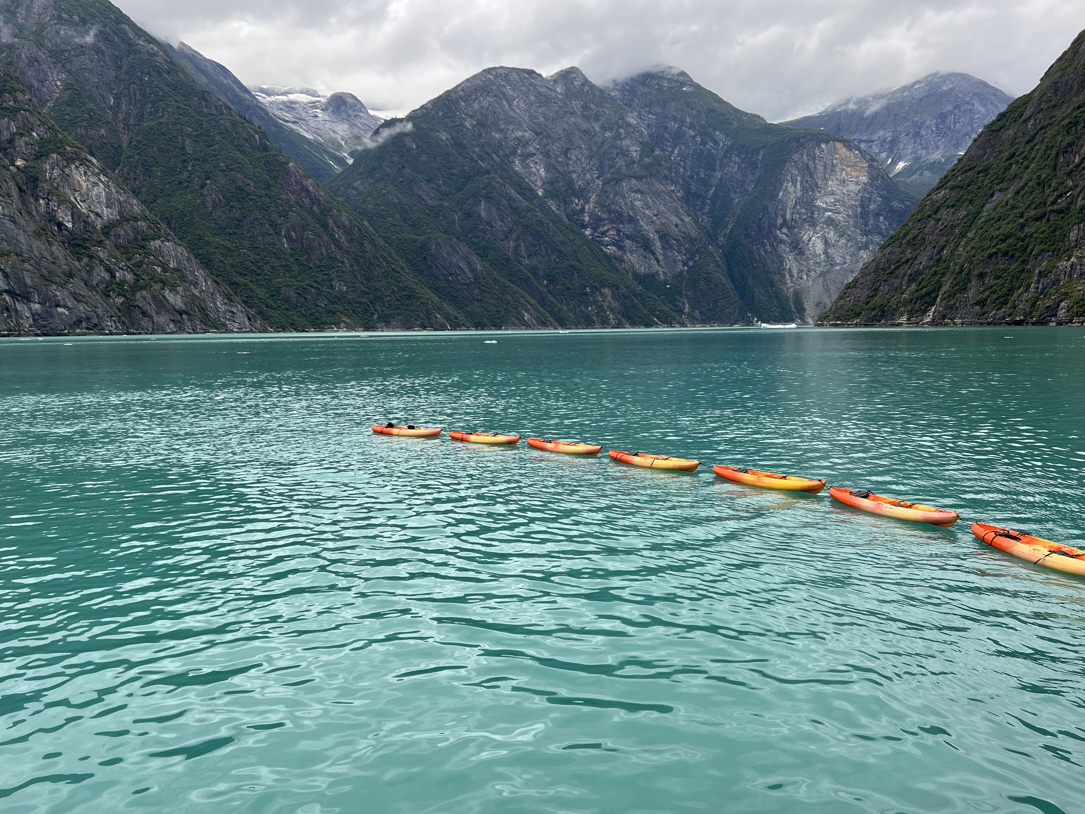 It was a foggy morning as we entered Tracy Arm, but just as we pulled into our cove for kayaking, the skies cleared. We spent the morning paddling around the turquoise waters and looking at the granitic rock faces, floating pieces of ice, and nearby waterfalls.