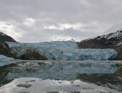 The ship stopped about two miles from the South Sawyer Glacier, and we got into small expedition boats to explore the icebergs and look for wildlife in this recently uncovered part of the fjord. About a third of a mile ahead of us sat the towering face of the enormous blue-white glacier, about 170 feet tall. Looking at it made one feel tiny. The floating ice pieces were beautiful; some were utterly clear, while others were striped, or seemed to glow electric blue. It was a bit like being in a fanciful, floating sculpture garden.
