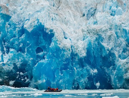 Thus began Day One of our expedition. Bundled in layers, and armed with binoculars and cameras, we tumbled into the small expedition landing craft for a closer look at South Sawyer Glacier and the many splendors in its vicinity. The sun flirted with clouds, poking in and out, and a cool pristine breeze blew down from the glacier top, making its way across the glacial green waters to dance on our skin and into our lungs. I remind people to take deep breaths, to fill up their lungs with this precious food, oxygen … and to exhale and give back to the trees and plants of this wondrous place. Moving about among exquisite pieces of ice, the small growlers, the mid-size bergie bits, and the larger icebergs, surrounded by high cliffs carved from the glacier, with numerous waterfalls flinging their gushing drops down to the waiting sea below. Other treasures of the morning … mountain goats, harbor seals, and various birds including common murres, marble murrelets, and pigeon guillemots. The cracking of white thunder as the glacier calved is a sound most won’t likely forget, nor the immensity of a whole column plummeting to the sea, causing a huge wake to lift our boats a half-mile away. And the finishing touch … a hot chocolate boat delivered molten libations to warm hands, bellies and souls. Yum!