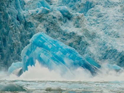 And then, it happened: larger and larger pieces of ice calved from the glacier, layer upon layer sheared clear of the face, and finally, in the midst of spray and flocking gulls, came a shooter like no other shooter. Intoxicatingly blue, like a submarine Godzilla rising from the deep, higher and higher until its ponderous mega-ton weight brought it to rest on the surface. Beside it, another shooter swelled from the water, ballooning into the air, water gushing from its sides. People were shouting, screaming, shrieking; shutters frantically clicked, backs were slapped in glee, and the naturalists were rendered speechless (an unusual occurrence). The giant blue bergs rushed from the glacier, and ice packed up quickly as the boats wisely exited the scene.