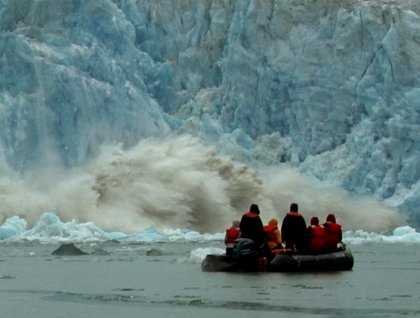 We explored this extraordinary cathedral in our expedition landing craft. The glacial face grew taller and then gigantic as we approached. Loud cracking sounds like gunshots echoed in the canyon walls. It was still difficult to believe that the face of South Sawyer Glacier was the height of a 20-story building until we saw massive blocks of ice topple down and smash into the sea. Later we became spellbound when a section 400 feet wide and the full height of the face crumble, causing a surging wave to erupt out of the glacier’s base and spread as an advancing arc at least 20 feet high. Ice bobbed and churned as the wave moved closer. Fortunately its short-lived energy dissipated before it reached us.