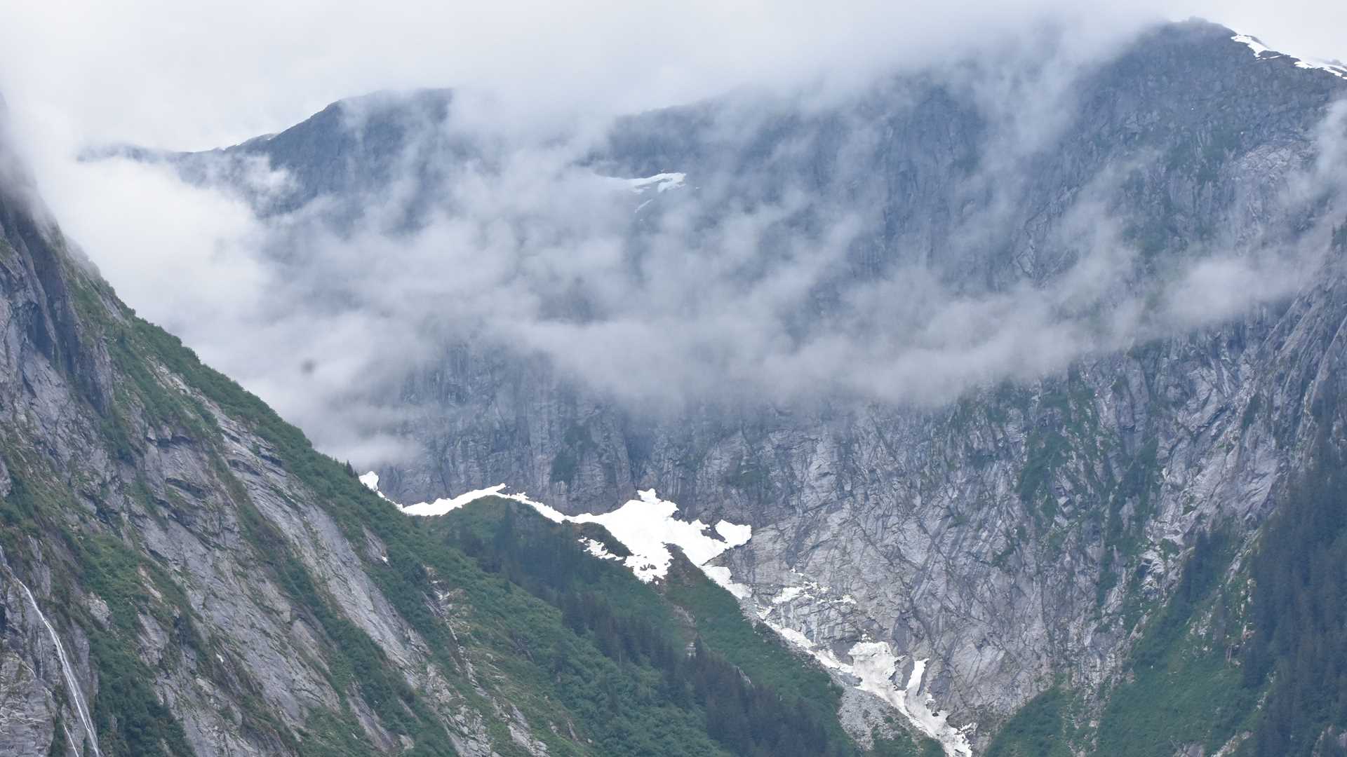 Under low-hanging clouds and through dense fog, National Geographic Quest made her way through the Tracy Arm Fjord system. With slow strolls past one gushing cascade after another, trees coated in a heavy, gray mist, and mountaintops that seemed to disappear into nothingness the higher we looked, we finally caught our first sight of a brilliant blue glacier face. Sitting about a half-mile from the glacier itself, our guests were in awe at the size and beauty of the Sawyer Glacier. After a few moments on the deck, we turned the ship and found a spot to float near Sawyer Island. From here, we dropped Zodiacs and ran guests up through a maze of blue-white icebergs, past a sea of curious harbor seals, and finally, to the face of the massive South Sawyer Glacier. After spending the morning among the giants of ice, we turned back again and made our way to the entrance and on to our next stop.