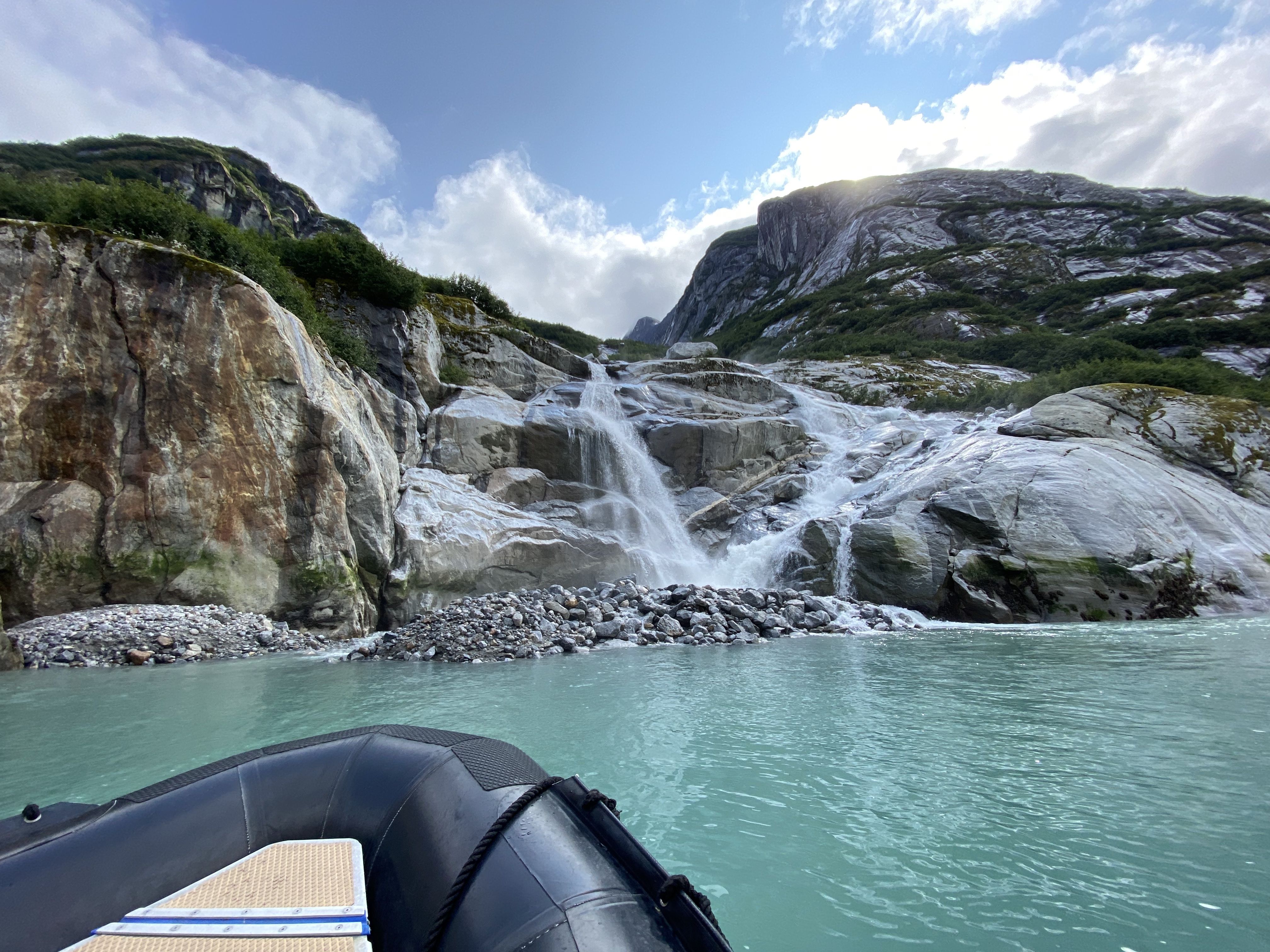 Finally, it was time for a closer look. We each found a spot in a Zodiac and wove around ice, skirted waterfalls, and felt the wind on our faces as we made our way to the face of the glacier. While we waiting to see the glacier face calve, we enjoyed listening to the sounds of the ice fizzing and knocking together, as the adorable gray faces of curious harbor seals peered at us from time to time. Suddenly, a giant block of ice sprang free from where it had been held in the glacier for the last few thousand years and plummeted into the fjord with a thunderous boom and a mighty splash. The calving continued and the sun even came out, showing off the blue ice in even greater brilliance, as we enjoyed having this incredible wilderness all to ourselves.