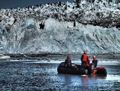 South Sawyer glacier was our destination for the afternoon. Brilliant sunshine lit the glacier and we cruised amongst the recently calved icebergs, bergy bits, and growlers. Several thunderous calving events kept our attentions glued to the glacier as our expedition landing craft bobbed in the ensuing waves. Pirates! Then the pirates arrived! Looking much like our bartender, galley crew, and Captain, a boatload of Viking helmeted hybrid-pirates driving the Coco boat scooted amongst the icebergs tracking down our cruisers delivering hot chocolate garnished with whip cream and Crème de menthe (where it was age appropriate), we savored the scenery and delighted in the spontaneous beverage service.