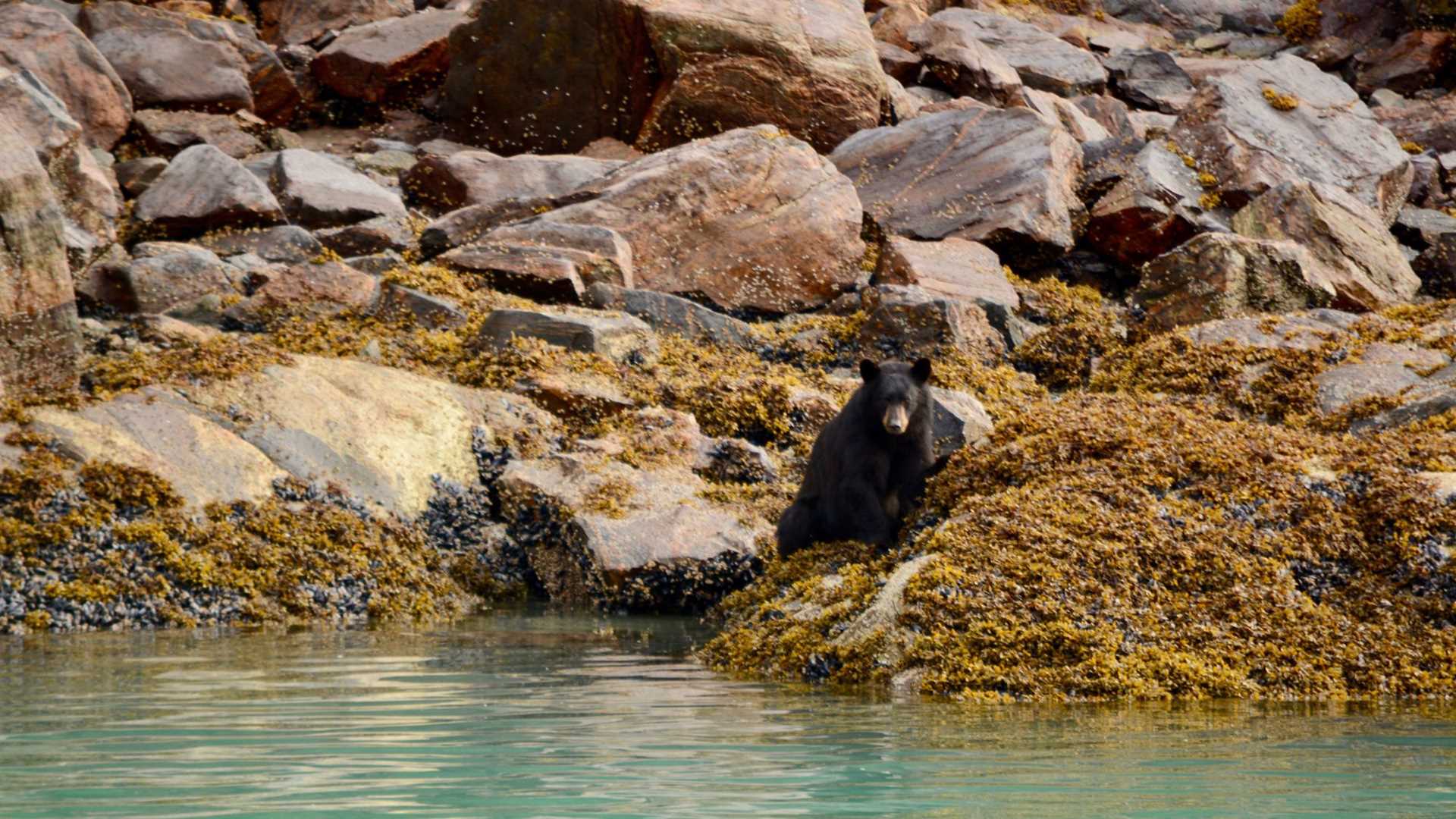 While rubbing our eyes and sipping our coffee, this morning we were called onto the bow for the encounter we had been waiting all week for: an American black bear in the intertidal zone, enjoying its breakfast. As we quietly watched from the ship, this bear munched on the barnacles and rockweed that was not quite submerged as the tide slowly rose. After about half an hour, we turned away, continuing into Tracy Arm fjord. Once again enjoying a spectacular lack of rain, the sun shone on the sheer mountainsides and sea foam green water that we would follow until it ended 22 miles later at the face of South Sawyer Glacier. This fjord is one of two arms of the Tracy Arm Fords Terror Wilderness Area, a pristine wilderness covering over 600,000 acres within the Tongass National Forest. For our morning excursion, National Geographic Sea Lion sent us exploring the last few miles in to the face of the glacier; it towers 200 feet above the surface of the water and continues 21 miles back to the Stikine Ice Field. On the expedition landing craft, we cruised around, hoping to see wildlife in the area, and our expectations were exceeded. Rounding one corner, we found a large family of mountain goats with their kids on the mountainside. The next corner exposed hundreds of harbor seals and their pups hauled out on icebergs, nursing until the pups are large enough to venture into the open ocean on their own. There was even a harbor porpoise cruising quietly through the water.
