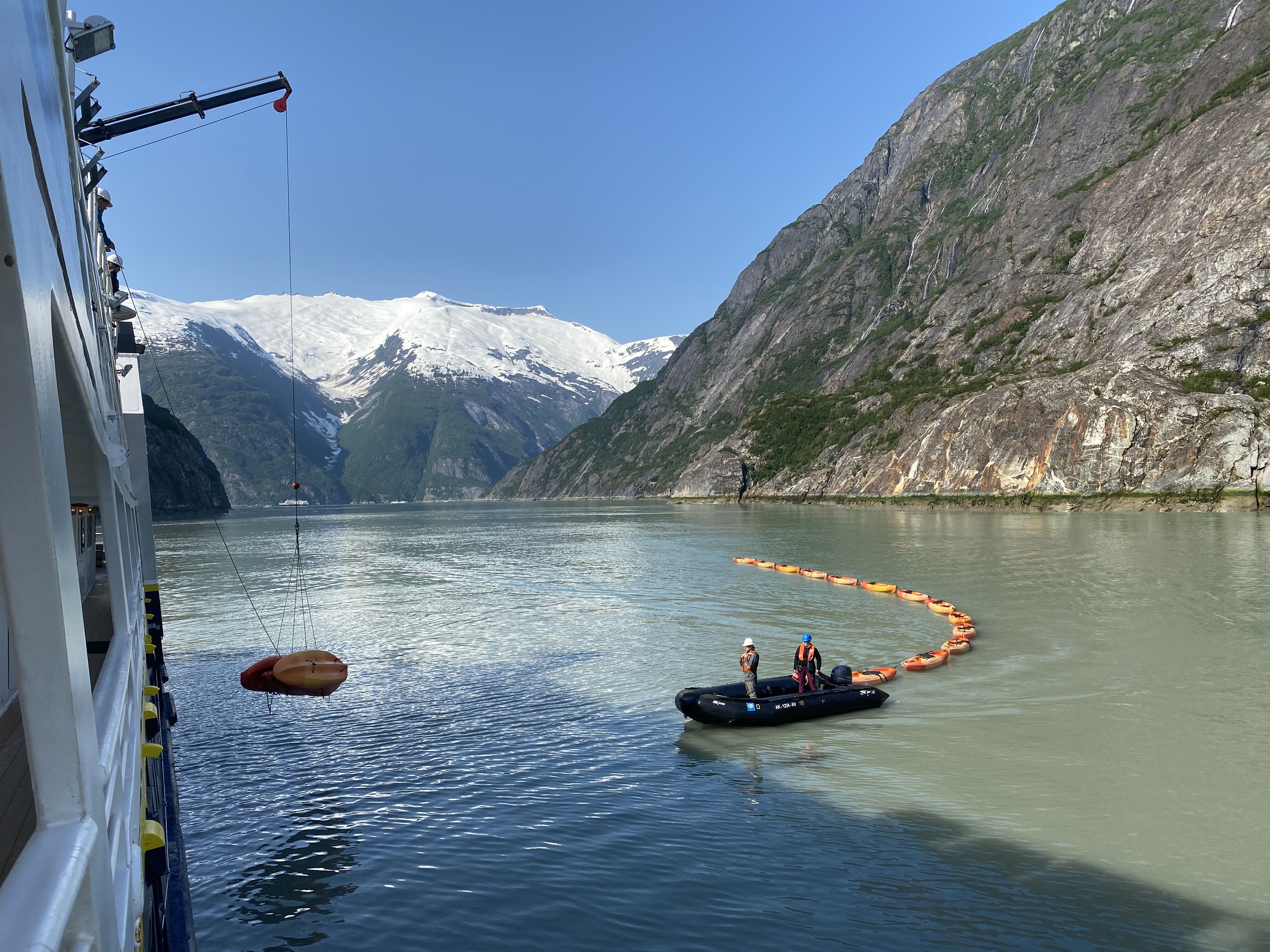 Overnight, National Geographic Sea Bird brought us through Frederick Sound and Stephens Passage from the Kuiu Islands to Holkham Bay. We crossed the bar–an underwater, terminal glacial moraine–at Holkham Bay in the late morning, and we enjoyed cruising through the tall, glacially carved walls of the dramatic Tracy Arm-Fords Terror Wilderness on a rare blue bird day. As we made our way up the fjord, naturalist and geologist Nicole Yamagiwa taught our guests about the glaciology of Tracy Arm from the bow of our ship. Is there any better way to learn about U-shaped valleys, moraines, cirques, hanging valleys, and roche moutonnée than with a geologist holding a whiteboard whilst sailing through the features you are learning about? I think not! It was incredible! A stop at Hole-in-the-Wall Waterfall was an incredible addition to our day. Upon arrival at our heave to location, our able crew lowered inflatable boats to the water, and our team of naturalists and photographers took our guests out by small watercraft to the South Sawyer Glacier terminus to explore icebergs, seals, glacial calving, and even mountain goats! At the end of our day, our guests enjoyed a last dinner aboard National Geographic Sea Bird , followed by a photography slideshow prepared by our photo instructor Lisa Hornak. It has truly been an incredible journey these last six days!