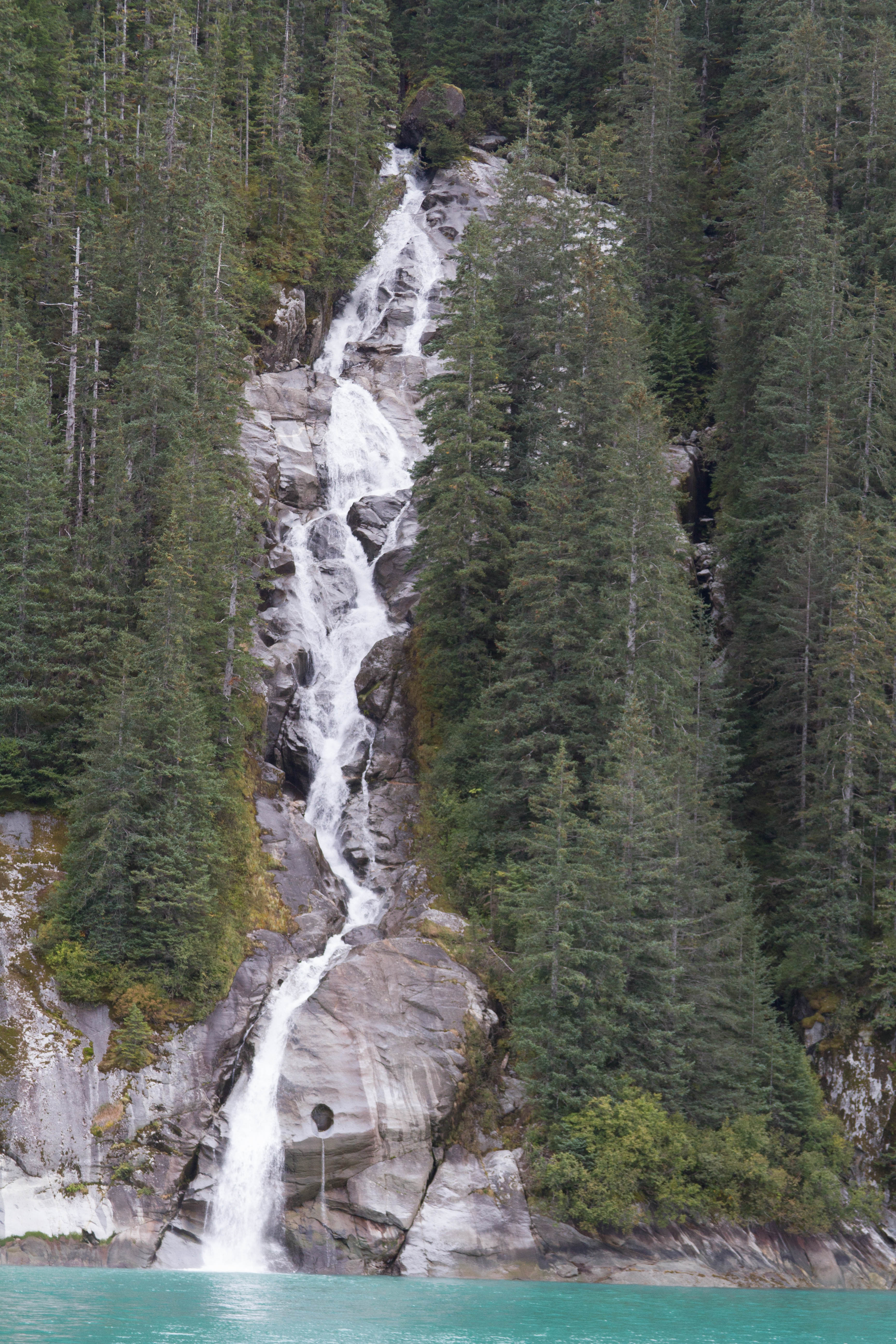 During the morning we traveled up the winding fjord of Tracy Arm.  All around was spectacular scenery rising a couple of thousand feet above the ship.  Along the way the bridge officers slowed to pull the ship slowly up to the rock walls of the fjord where waterfalls plunged over the near vertical rock walls of the fjord.  Cameras were always at hand as the scenery continually shifted and changed.
