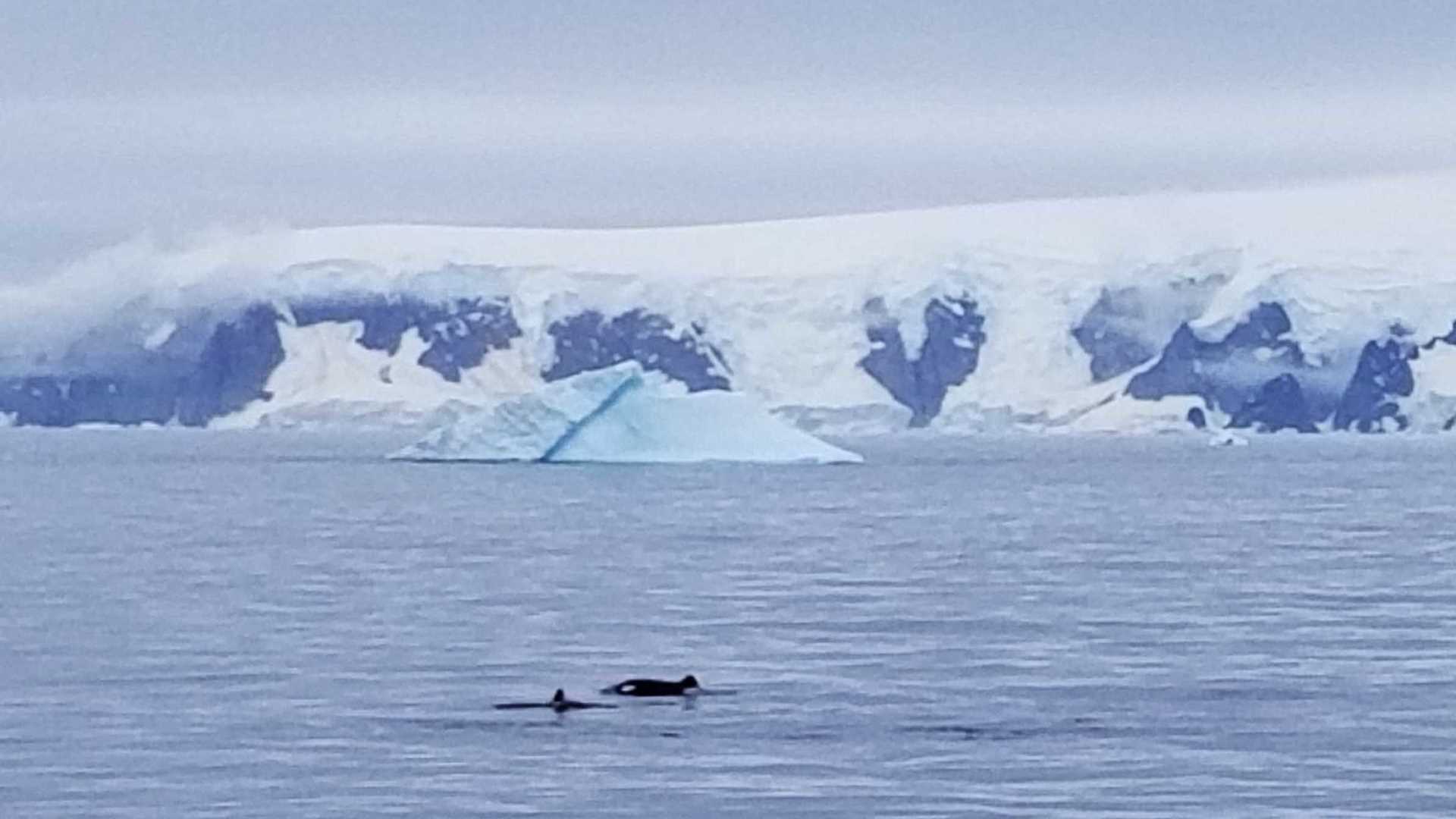 In the afternoon, we spotted three killer whales in the Orleans Strait. We watched the beautiful whales swimming and diving. The curious thing about two of the whales was their dorsal fins were truncated, possibly by entanglement in fishing lines near South America. These were Type A killer whales, which eat a wide variety of animals such as toothfish, seals, and minke whales. All the time, there were dozens of unnamed glaciers and mountains onshore in the complete polar wilderness.