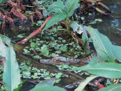 Our final outing of the day was to explore the El Dorado River by skiff. Along the way we saw the prehistoric-looking hoatzin bird with its Mohawk-like headdress. It nests over water, and the young have claws on their wings. This is an adaptation that allows them to jump into the water if a predator comes and then climb back up the tree to the nest.