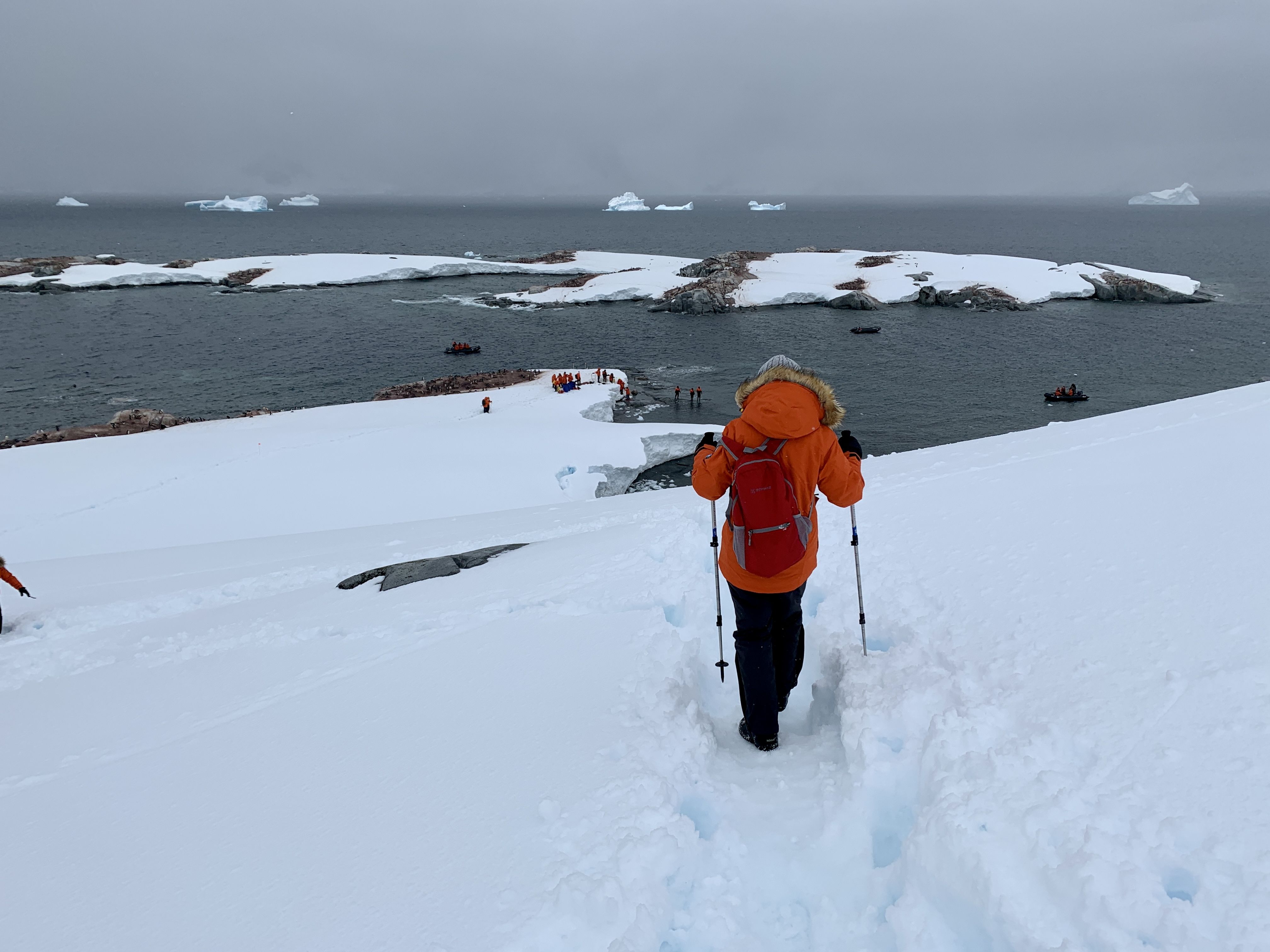 We spent Christmas Eve morning around Useful Island with two rounds of Zodiac cruises to look at icebergs and penguins. We also had a landing on the island, which is home to a colony of gentoo and chinstrap penguins. There was an optional hike up a steep snowy trail to the top of the island for a scenic view. At the top, there was a red metal cylinder used to survey the islands. There were also nesting sites for both gentoo and chinstrap penguins at the summit.