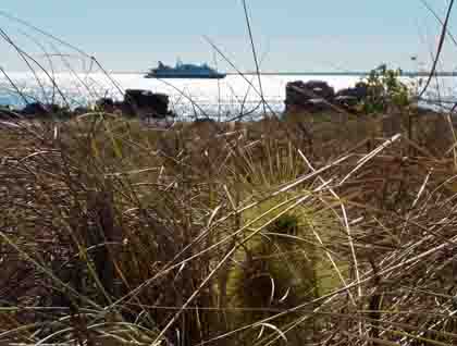We then returned to the Zodiacs and headed to a second beach, where our mission was to investigate the site of a crashed C-53 Seahawk. The remarkable story about this plane was recounted in detail; how the plane got lost on its way to Broome shortly before it was bombed by the Japanese, how the pilot pulled off a belly-first landing to save the crew and two passengers, and how they were able to survive for several days on only their ingenuity. On the way to see the plane, we passed an osprey (Pandion haliaetus) nest on a small pile of rocks. While no breeding had yet taken place, an adult was attending the nest. We also spotted other large birds, such as a Jabiru (Ephippiorhynchus asiaticus) and some brolgas (Grus rubicundus).