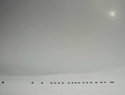 Sure enough, as we turned onto the winding dirt road leading up to Skálafellsjokull (a tributary of the mighty Vatnajökull) we slowly emerged out of the shroud and were greeted with blue skies and distant mountains floating above the whiteness below. A fleet of snowmobiles and trucks awaited us at the top of the road for an outing on to the glacier. Motoring over flat, unassuming terrain it is hard to comprehend the pressures at work beneath one’s feet as the ice, despite its overall retreat, continues to grind forward, continually adding rocks and sediment to the milky grey waters below.