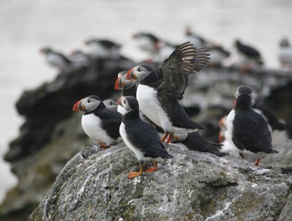 A 6:30 a.m. announcement that a pair of humpback whales were just off our bow began our morning as we sailed toward Vigur Island in the West Fjords of Iceland. Slowly cruising through the water, these wonderful animals were feeding. With a backdrop of basaltic cliffs and whirling seabirds, the scene was a splendid photographic opportunity which many guests took advantage of. Our anchor dropped, the first Zodiacs headed to the small floating dock on the small island of Vigur. There we were warmly welcomed by Magnus, one of the sons of the owners of the island, which is now a nature reserve. It had been in the possession of his family for several generations. Fishing, raising sheep , catching puffins, and gathering the down from eider duck nests have been, and still are, the mainstay activities here. Sixty kilos or so of eider down are processed each year. Thousands of puffins, black guillemots, and arctic terns frequent the island which is in addition a veritable rock garden of wild flowers. Our short visit completed, we returned to our ship for a relaxing morning as we continued our explorations of the West Fjords.