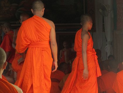 In the afternoon, we went on shore for a visit, a short bus ride away, of Wat Nokor, providing a preview of the kind of late 12th century temples built at Angkor. In more recent times, the old Mahayana Buddhist sanctuary morphed into a Theravada Buddhist complex with brightly decorated buildings. Novices and monks were strolling and resting among the ruins.