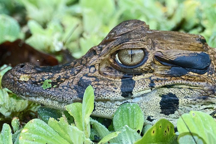 During our afternoon exploration, we put on our rubber boots to explore a non-flooded forest trail known as Casual. This exploration site offered the opportunity to encounter an adult green anaconda. Green anacondas are the heaviest of the species and the second longest. Their bodies our adapted to an aquatic lifestyle, so their eyes and nostrils are on top of their heads and their patterns are camouflaged in the water’s vegetation. We found one of the small reptiles in a small rainwater pond.
