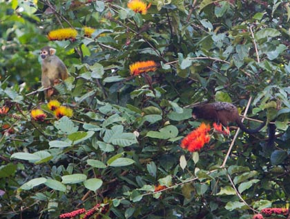 Soon, we are spotting more wildlife. An iguana is basking in the early morning sun. Small in size but long in name, a yellow-crowned brush-tailed rat peers out of its hole. Kingfishers rattle as they fly above while black-collared hawks scream at us. A beautiful red-and-orange flowered vine is attracting quite a lot of attention, and two species of monkey are feeding together. We silently sneak up in our kayaks to a bug-eating machine, an iridescent bluish-fronted jacamar. Sharp eyes spot a sloth, feeding on young leaves. Soon, it starts moving down, coming nearly to the ground and giving us our best views yet of a sloth. After a quick visit to a local village for some handicrafts, we make our way back to home sweet home, the Delfin II. As we are sipping fresh squeezed cocona juice, we watch capuchin and squirrel monkeys feeding beside the ship.