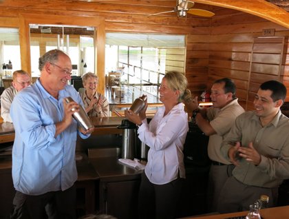In addition to the wildlife and rain forest plants we have seen this week, we have also been learning about many of the foods of the region. We eat local fish, fruits, and vegetables. And when in Peru, one should try a pisco sour, too. Pisco is a type of brandy distilled from wine and only made in Peru and Chile. It is also the official national drink of Peru, and the favorite drink of many of us now that we have been sampling them for a week. Just before lunch we had some fun learning how to make pisco with our bartender Martin. The recipe was pretty straight forward, but the final touch was the shaking. To make sure we had the right rhythm, there was music. Several of us got to show off our dancing skills while shaking the drinks, but Martin still has the best moves!
