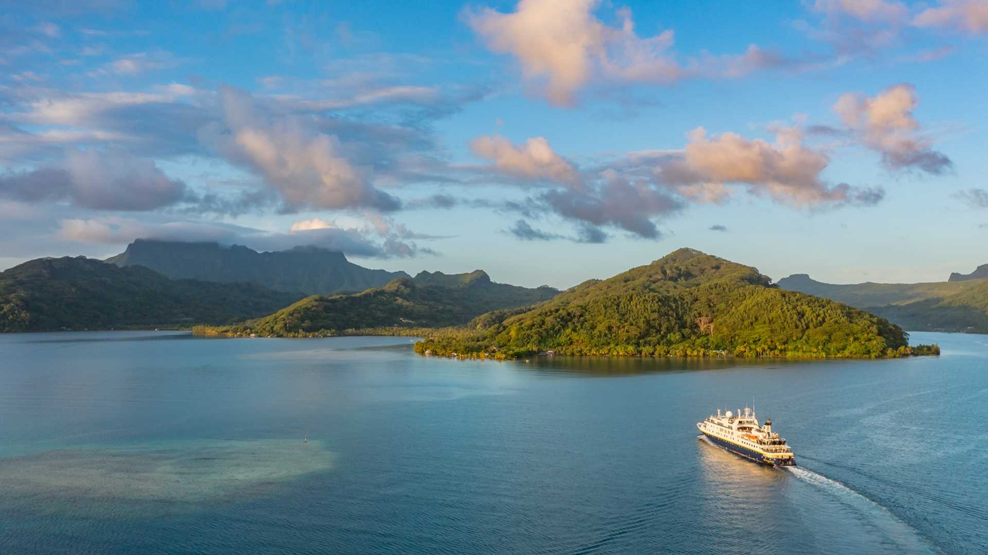 The National Geographic Orion looked right at home in Port Bourayne at Huahine. Zodiacs were waiting to shuttle guests ashore this lesser-known island where they discovered a small but riveting historical museum, fascinating archeological sites, lush landscapes, and Huahine's sacred blue-eyed eels.