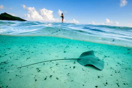 Snorkeling with rays is just one of many exhilarating experiences to look forward to on a voyage in French Polynesia. Guests got a close look here at a pink whipray in the waters of Mo'orea. These inquisitive and gentle rays inhabit the region's lagoons, sandy flats, and coral reefs.