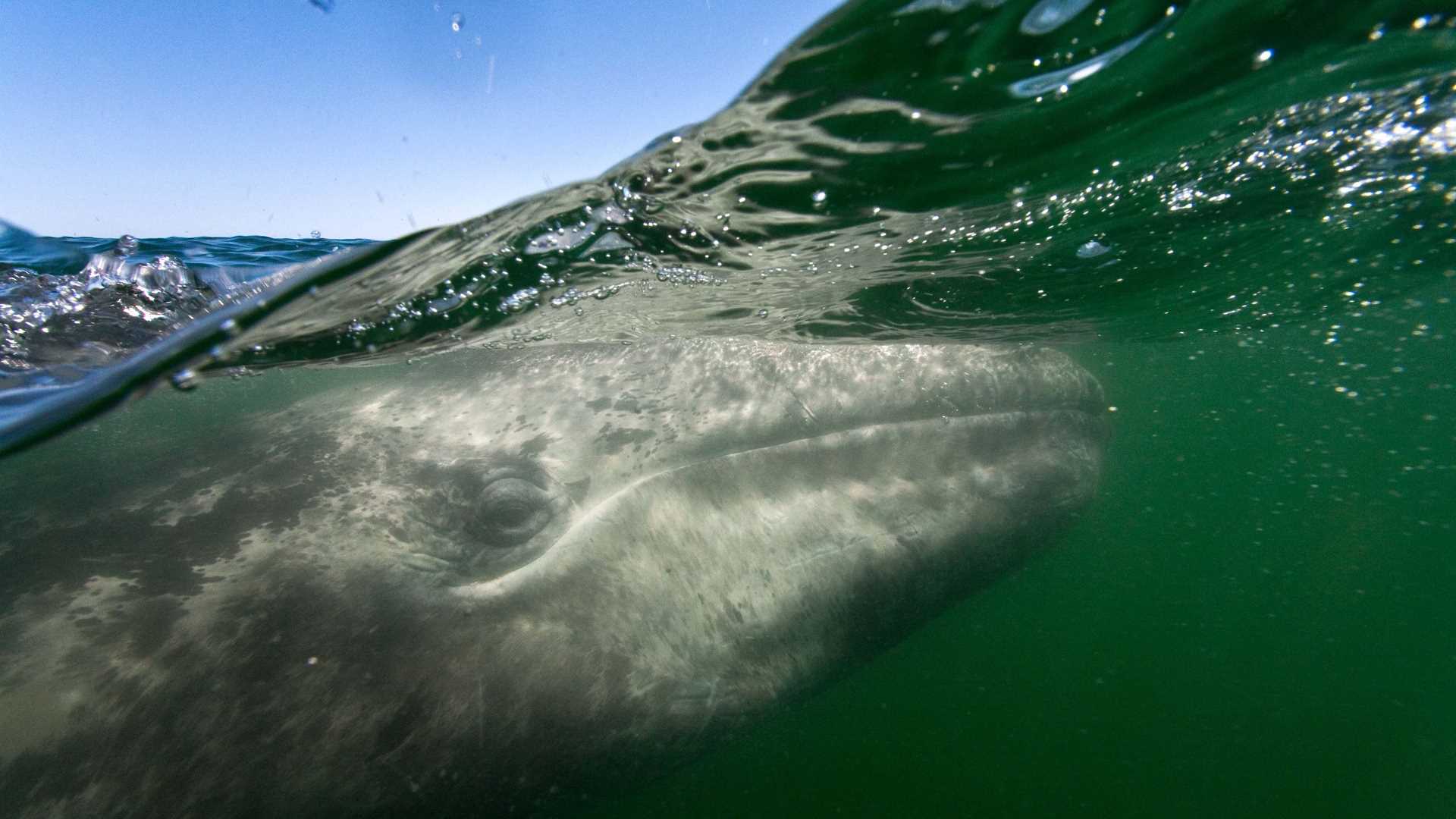 I was on my knees, chest and body draped over the warm, black tube of a Zodiac, peering into the water of Baja's Magdalena Bay. Fellow passengers, also on their knees as if in some odd position of prayer, searched the limits of their vision. Pacific swells rolled through the mouth of Boca de Soledad and made their way along the channel to rock the boat with a gentle motion. It was a day to feel connected to the Earth. We were surrounded by a dome of pale blue sky with light wisps of clouds. Shorelines of soft beige sand dunes formed the horizon, broken only by the distant olive strands of mangroves and the dancing water at the lagoon entrance. Suddenly, our gaze was riveted by a slight color difference in the water. The light green turned just a bit grayish. Our eyes strained to see the mottled fuzzy blotches on the object that rose slowly toward us.