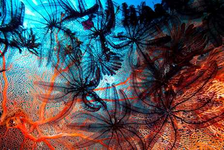 From giant clams to whale sharks, dugongs, and nearly every species of sea turtle, an astonishing array of life thrives in the robust marine ecosystems surrounding Indonesia. It is possible to encounter harmless epaulette sharks in Cendrawasih Bay; blue spotted stingrays, moray eels, turtles, and whale sharks in the Anambas archipelago; and in the Banda Islands, blue, humpback, and pilot whales are common sights in water four miles deep. Don't forget the delightfully bizarre mudskippers of Papua New Guinea, fish who walk on their fins when the tide is low. The list of undersea discoveries is infinite: Each island will reveal new dazzling denizens in kaleidoscopic worlds full of surprises.