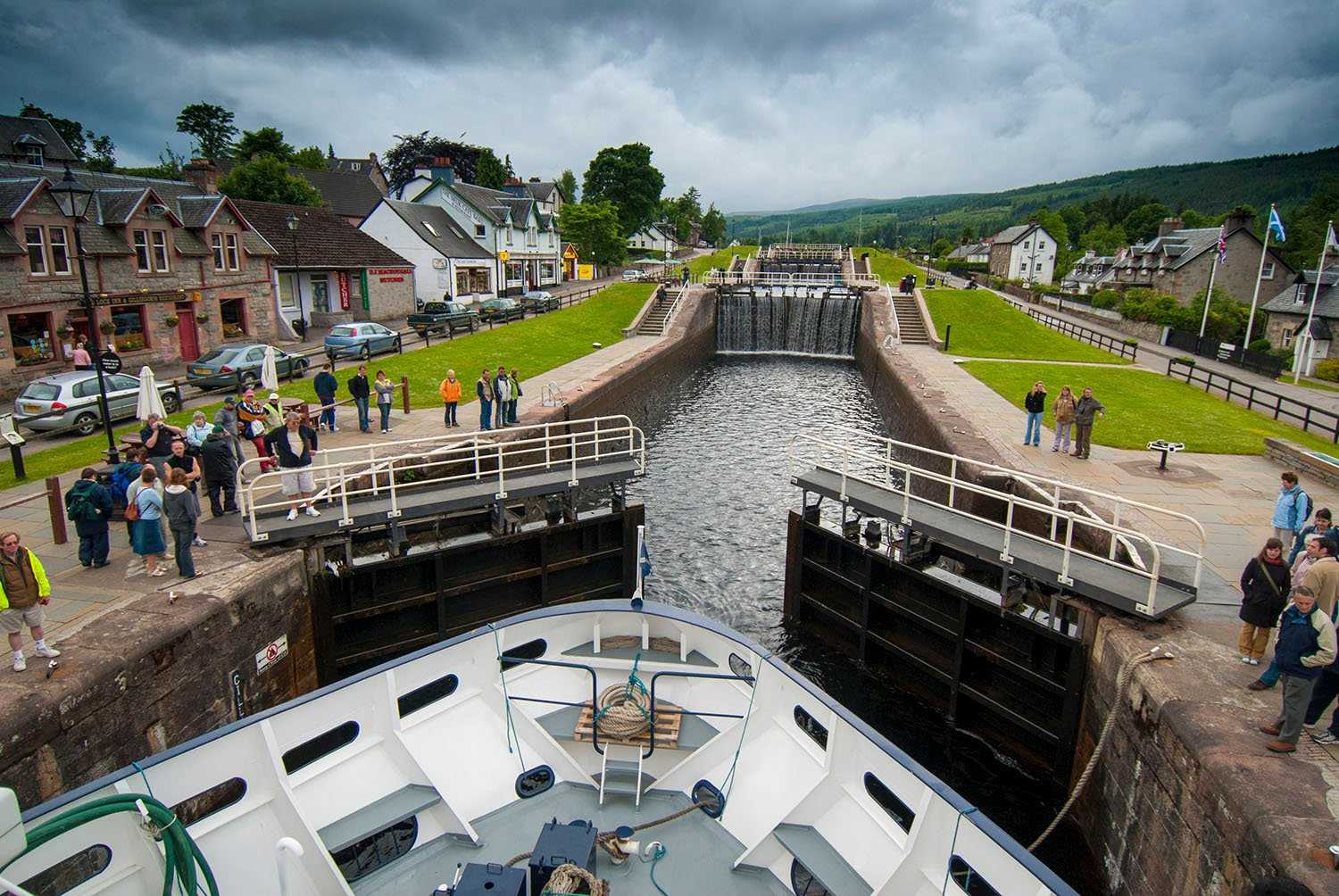 Leaving the last lock on the Caledonian Canal and venturing out onto Loch Linnhe is always a grand sight—Scotland’s highest mountain, Ben Nevis, commands the view, while Fort William hugs the shore at its base. These are tidal waters that take the Lord of the Glens out into the islands of the Inner Hebrides. Fort William has seen its share of history, from clan feuding, through to Oliver Cromwell’s invasion and the Jacobite uprisings. The site of the last loch is Corpach, its name reflecting ancient times when the corpses of Scottish kings departed for their burial on Iona from here.