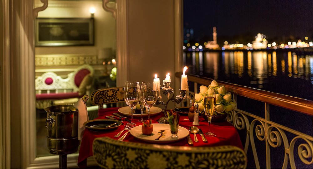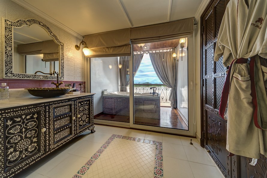 The poet could only have dreamed of The Jahan’s Lord Byron Suite. Its 549- square feet include a king-size wooden four poster bed flanked by peacock-accented lamps, walls adorned with murals of bucolic life in Mughal India, multiple sitting areas, and a private deck from where guests can view the passing scenery from their own private Jacuzzi.