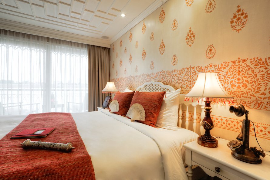 Eastern and Western designs blend seamlessly throughout the ship. Carved doorways and wainscoting, elegant wall stencils, and circa-1900-style telephones are some notable elements. Other special touches include handsome wooden furniture inset with mother of pearl, and Indian art and artefacts adorning the walls in both public spaces and staterooms. Comforts like spacious walk-in showers, Jacuzzi, and fine bedding are also not to be overlooked.
