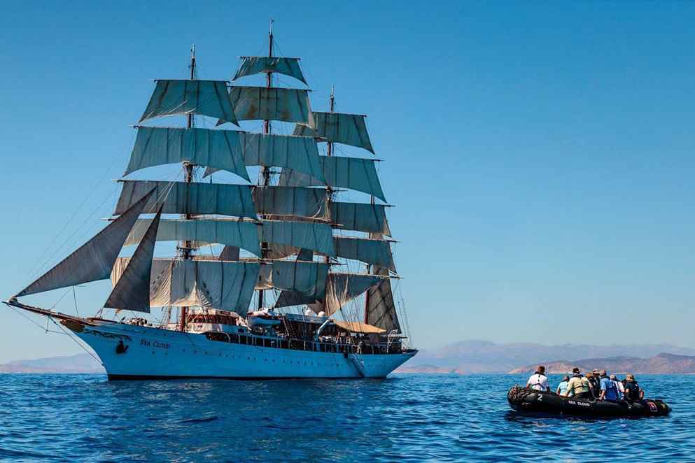 The combination of the island’s volcanic past, natural resources, and cultural history result in dazzling white villages punctuated by blue domes and set between the turquoise sky and the cerulean Aegean. Add fertile soil that produces tomatoes, white eggplants, fava beans, and of course the grapes that are made into Santorini’s well-known wine, and one can understand why this dramatically beautiful island is such a compelling location to visit. The icing on the cake? Looking down from Oia over whitewashed homes hugging the cliffs, down to the caldera that shelters our gracious ship Sea Cloud.