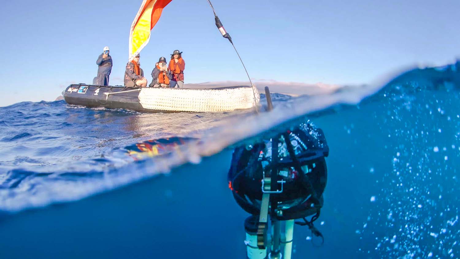 As part of the Global Explorers program, youngsters explore Urbina Bay in a zodiac craft and even get to take the wheel.