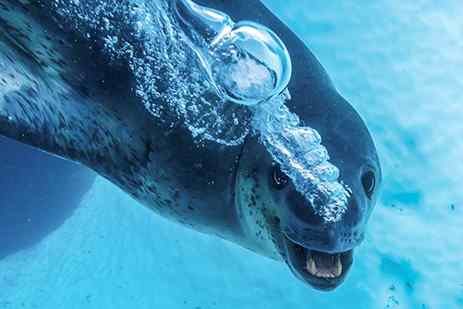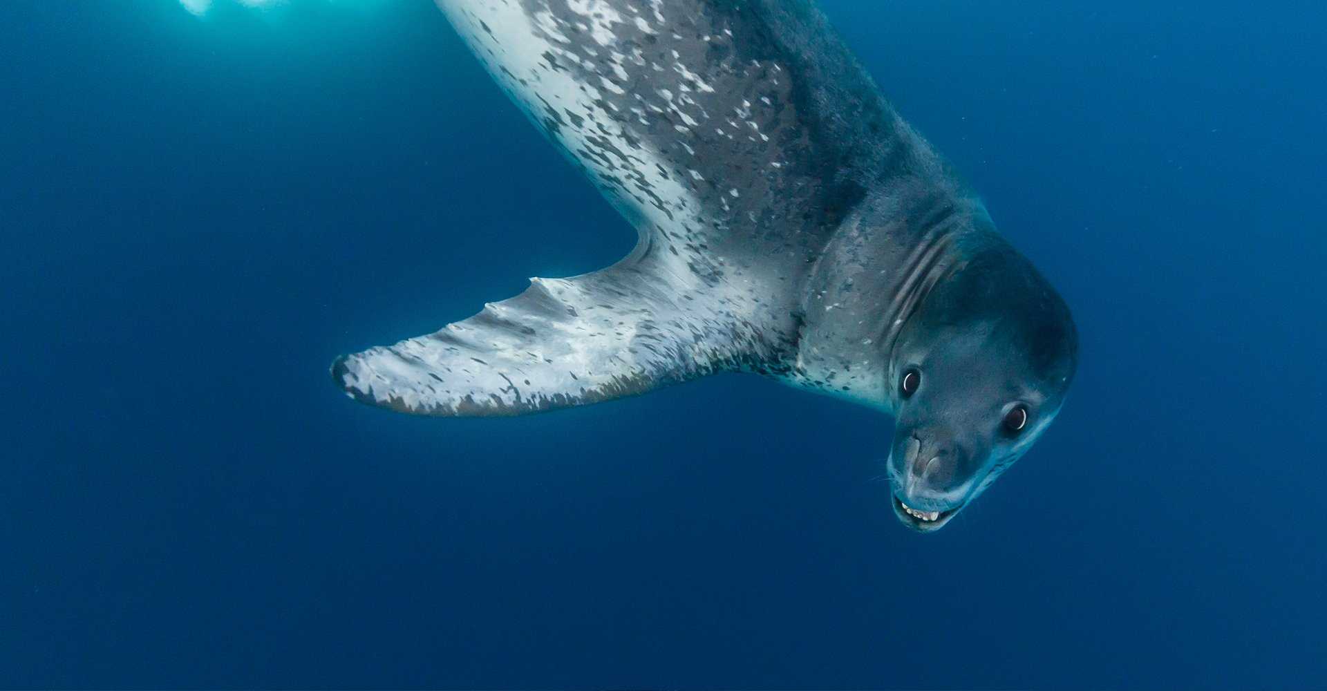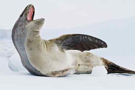 The corners of a leopard seal’s mouth curve upward, resembling a smile—but underneath that deceptively sweet disposition are large canines designed for the kill. The only seal that regularly hunts warm-blooded prey, leopard seals grab penguins (and even other seals!) with razor sharp teeth, then violently thrash their catch back and forth.